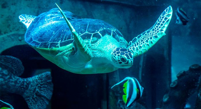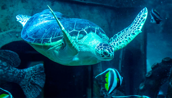 Через основное смотровое окно главного аквариума, сидя на расположенных ярусами скамьях, посетителям удобно наблюдать жизнь обитателей аквариума или смотреть захватывающее шоу кормления морских обитателей. Зеленая морская черепаха грациозно плавает у самого стекла аквариума, буквально позируя для желающих сделать фото на память посетителей Океанариума.